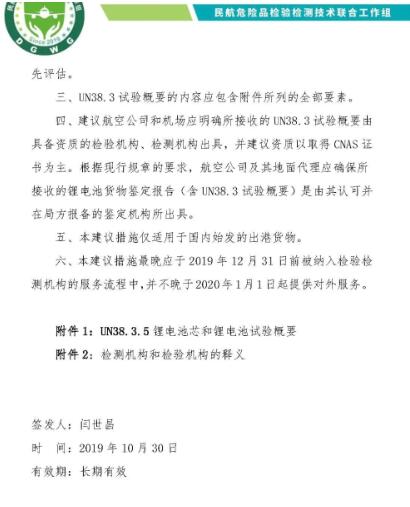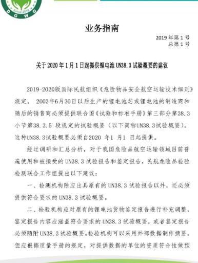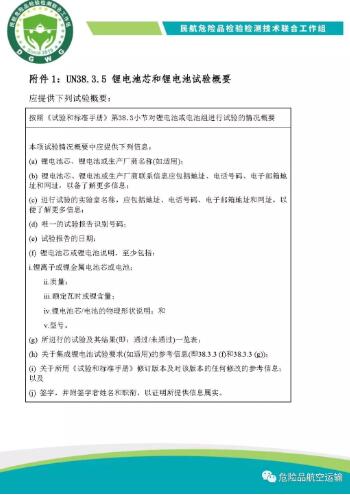 2019-2020版國際民航組織《危險物品安全航空運輸技術細則》規定,2003630日以后生產的鋰電池芯或者鋰電池的制造商和隨后的銷售商必須提供聯合國《試驗和標準手冊》第三部分第38.3小節第38.3.5段規定的試驗概要(以下簡稱UN38.3試驗概要)。