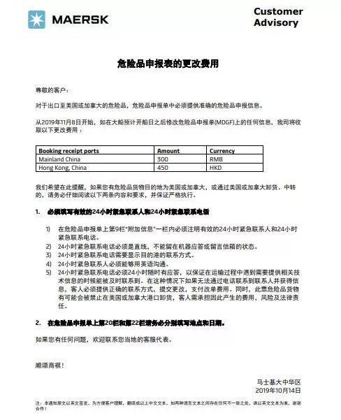 出口至美國或加拿大的危險品,危險品申報單中必須提供準(zhǔn)確的危險品申報信息。從2019年11月8日開始,如在大船預(yù)計開船日之后修改危險品申報單(MDGF)上的任何信息,馬士基將收取更改費。
